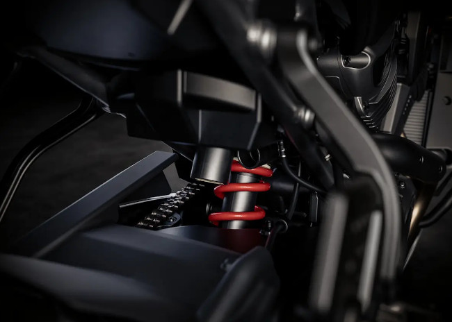 Der Motor dient als mittragendes Fahrwerk­selement und macht einen herkömmlichen Rahmen überflüssig. Das ist Performance, die man wirklich fühlen kann – mit niedrigem Schwerpunkt und verwindungssteifem Fahrwerk.
