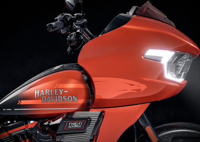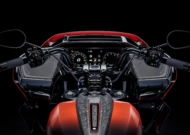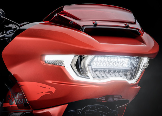 Die charakteristische Sharknose-Verkleidung ist sowohl wirksamer Wind- und Wetterschutz als auch ein Stilelement. Sie besticht durch herausragende aerodynamische Performance und verstärkt den eindrucksvollen Auftritt der CVO Road Glide ST. Das rot getönte Windschild passt zu den Akzenten in Performance Red und erzielt ein konsistentes, renninspiriertes Aussehen, das Dir den Eindruck vermittelt, Du bist der König der Bagger-Fahrer. Coole Sache, oder?