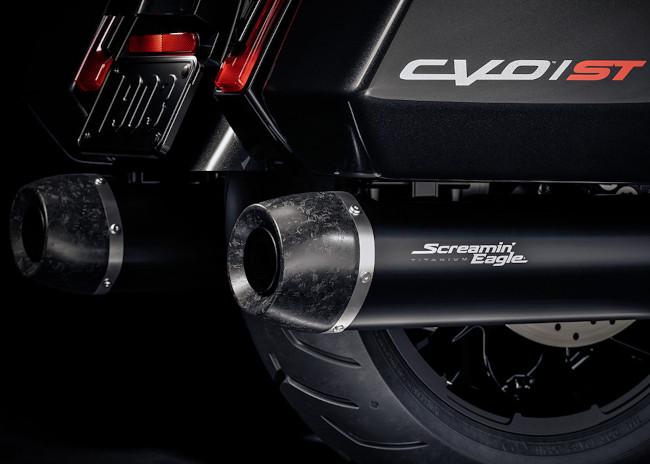 Die Screamin' Eagle Titan-Schalldämpfer mit schwarzer Pulverbeschichtung und Endkappen aus Forged Carbon liefern einen aggressiven Sound, reduzieren das Gewicht und verbessern den Gasdurchsatz. Ein visuelles und funktionales Upgrade, das bei jedem Dreh am Gasgriff Racing-Athmosphäre aufkommen lässt.