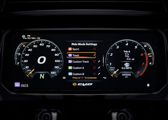 Acht frei wählbare Fahrmodi, die für jeden Typ von Fahrer entwickelt wurden. Road, Rain und Sport bieten Sicherheit und Kontrolle bei wechselnden Bedingungen, während Track und Track+ das ganze Potenzial der 2026er Harley-Davidson CVO Road Glide ST erschließen, damit Du bei nur minimalen Eingriffen der optimalen Performance so nahe wie möglich kommst. Drei Custom-Modi runden die Auswahl ab, damit Du die Performance ganz nach Deinen Wünschen abrufen kannst.