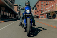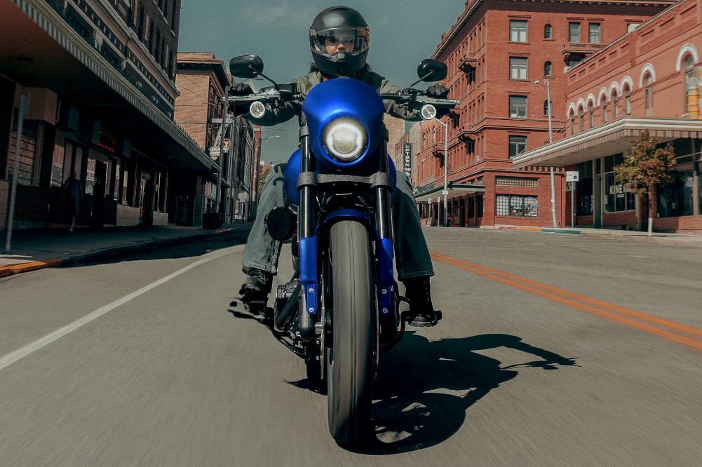Ein Motorradlenker mit 1 Zoll Durchmesser auf 4 Zoll hohen Risern, ein tiefer Solo-Sitz, mittig montierte Fußhebel und eine farblich abgestimmte Mini-Speed-Screen-Verkleidung, die den Scheinwerfer und die Blöcke umrahmt wie der Wind, der die Autobahn hinunterjagt. Der Antriebsstrang, die Frontpartie und der Auspuff sind komplett verdunkelt, mit Radiate-Aluminiumgussrädern (19-Zoll-Vorder- und 16-Zoll-Hinterdurchmesser), die in Matt-Dunkel-Bronze lackiert sind, um einen Kontrast zu den dunklen Komponenten des Motorrads zu bilden.