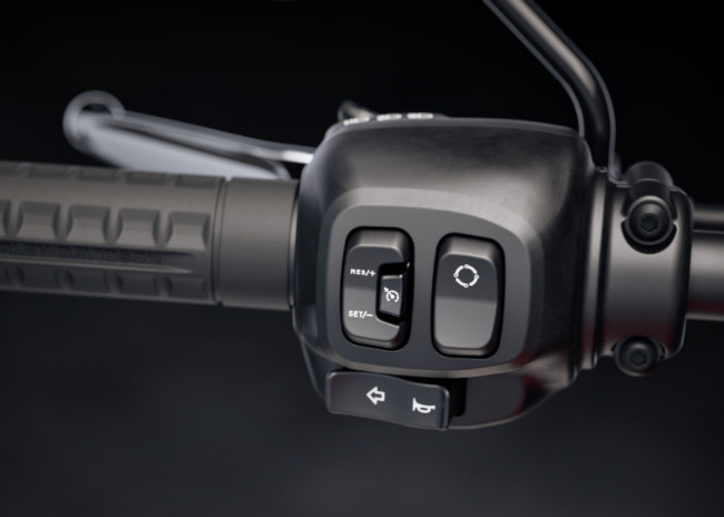 Die Lenkerarmaturen beinhalten die Bedienung der Fahrerassistenzsysteme, der Geschwindigkeitsregelanlage sowie der Antriebsschlupfregelung, und der verstellbare Bremshebel lässt sich an die Vorlieben des Fahrers anpasseben des Fahrers anpassen.