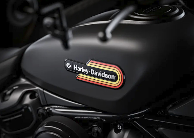 Eine flache Linie von Tank zum Kotflügel und ein erdnussförmiger Luftfilterdeckel greifen die klassische Sportster DNA auf, ergänzt durch eine vom Stil der 1970er Jahre inspirierten Tankgrafik.