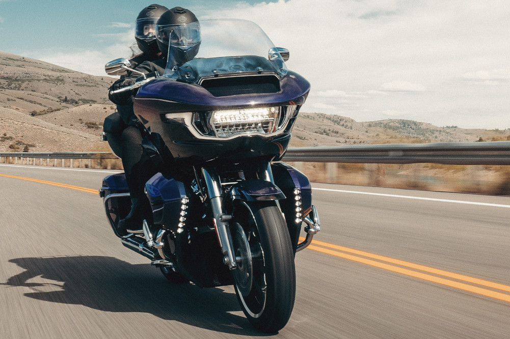 Das höhere und neu geformte Windschild leitet den Luftstrom um Fahrer und Sozius herum und sorgt so für eine angenehmere Fahrt. Dadurch spürst Du weniger Müdigkeit nach langen Tagen auf dem Bike. Das neue Profil fügt sich auf natürliche Weise in die Frontpartie der Road Glide Limited ein und bietet gerade genug Schutz vor dem Wind, um für Komfort zu sorgen, ohne dass das Motorrad sein beeindruckendes Aussehen und Fahrgefühl verliert.