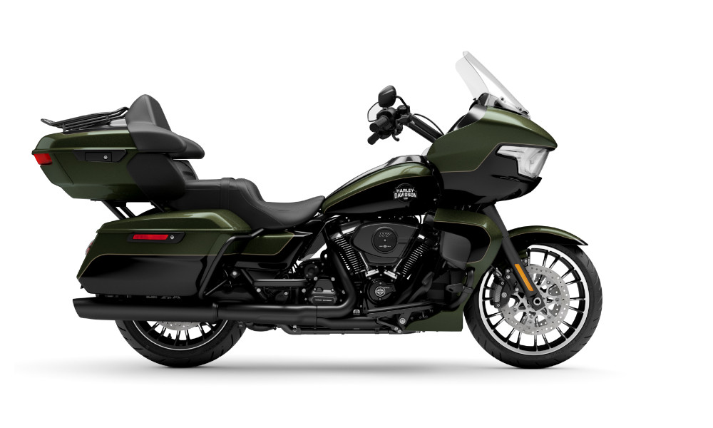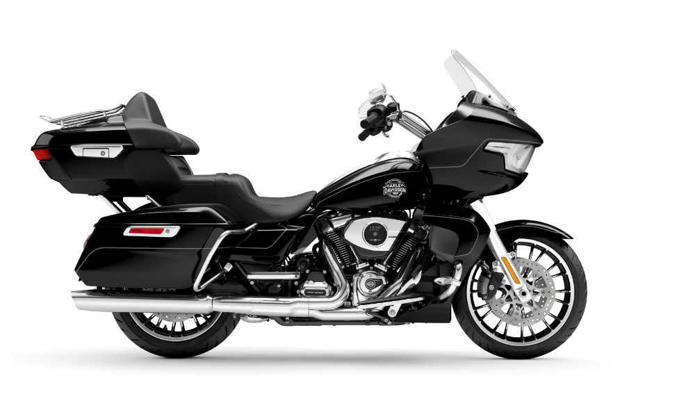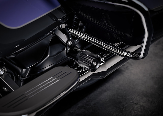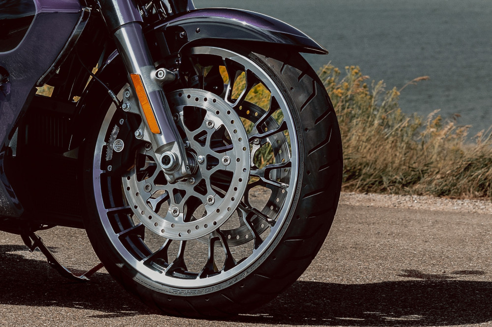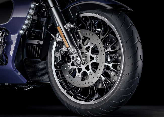 Die neuen Leichtmetallgussräder verleihen der Road Glide Limited eine kantigere, modernere Wirkung. Das Speichendesign ist dabei zweigeteilt – es beginnt an der Nabe mit 10 Speichen und endet an der Felge mit 20 Speichen. Am ganzen Motorrad finden sich Komponenten aus der Streamliner Collection, und das Bild wird abgerundet von Schutzbügeln für den Motor und die Seitenkoffer.
