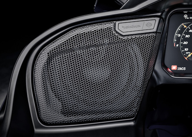 Ein 4-Kanal-Verstärker mit 200 Watt Leistung (50 Watt für jeden Kanal) unterstützt aktualisierte 165 mm große Lautsprecher von Rockford Fosgate, um klare Höhen und tiefe Bässe zu liefern. Das Audio-System liefert auch bei hohen Geschwindigkeiten einen kristallklaren Sound, der die Wind- und Motorgeräusche übertönt.