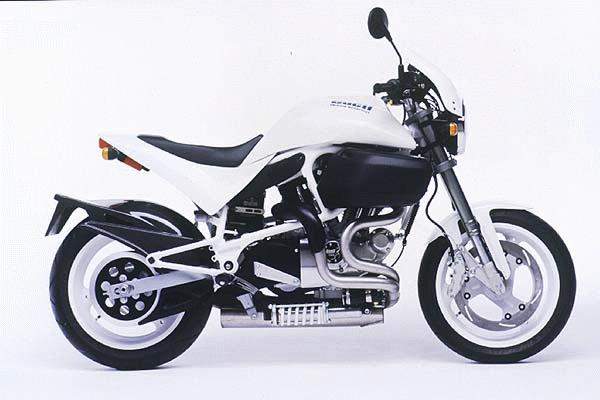 Diese Sammler-Buell schlechthin, deren Herz das Harley-Davidson-Triebwerk XR 1000 ist, errregte nicht nur wegen ihrer ausgezeichneten Aerodynamik und ihres unter dem Motor angebrachten Federbeins - beim Ausfedern des Hinterrads komprimiert es, beim Einfedern umgekehrt - Aufsehen. Ca. 50 Stück wurden produziert. |
