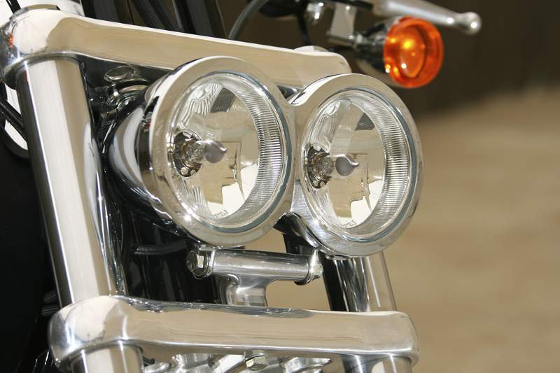 Eine extrem coole Sitzposition dank flachem Drag-Bar-Lenker und vorverlegten Fußrasten, ein unerhört provokanter Doppelscheinwerfer, ein armdicker Custom-Auspuff mit geschlitztem Hitzeschild im Look einer Thompson-Maschinenpistole,