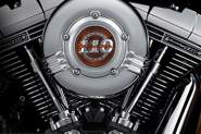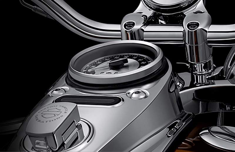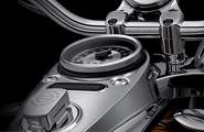 Neue geschlitzte Sechsspeichen-Gussräder aus Leichtmetall in Mirror Chrome verleihen der Screamin’ Eagle® Dyna® eine Extraportion Coolness. Chromglanz prägt die gesamte Frontpartie, von den verchromten Tauchrohren und Gabelbrücken der Upside-Down-Gabel mit 43 Millimeter Standrohrdurchmesser bis zur passenden Bremsscheibe im 21-Zoll-Vorderrad. Das 17-Zoll-Hinterrad ist mit einem 170 Millimeter breiten Reifen bestückt. Der axial leicht nach hinten verdrehte Custom Fender über dem Vorderrad rundet die glänzende Frontpartie perfekt ab. Die neue Telegabel mit leicht verkürzten Federwegen und reduziertem Gabelwinkel schafft den Spagat zwischen geschmeidigem Fahrkomfort und höchster Lenkpräzision.