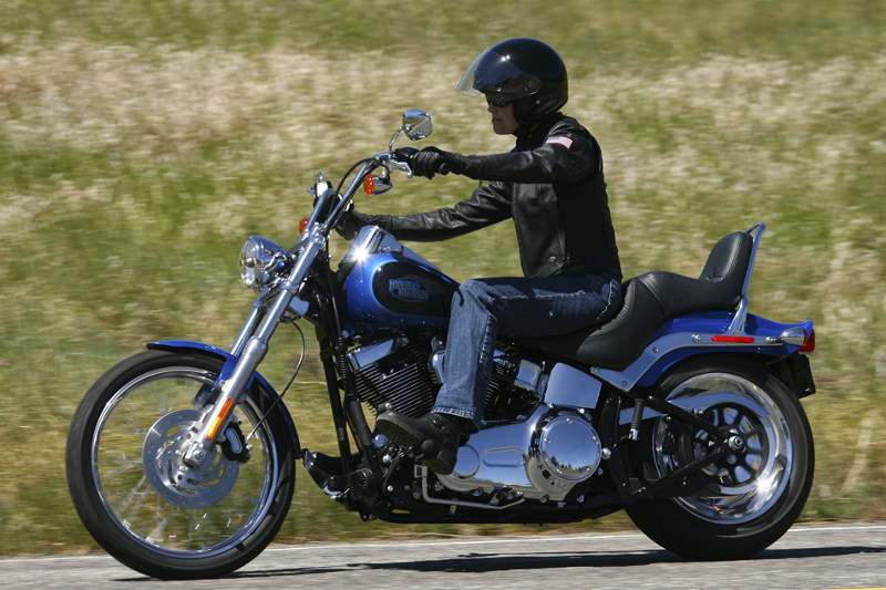 Die FXSTC Softail Custom zeichnet sich durch eine klassische Chopper-Sitzposition mit hohem Lenker und weit vorverlegter Fußrastenanlage aus. Ihre langgestreckte Chopper-Silhouette und der Komfort einer Doppel-Sitzbank mit Rückenlehne bieten auch auf langen Strecken mit Beifahrer ein Höchstmaß an Fahrkomfort. Ein markanter 200 Millimeter breiter Hinterradreifen unter einem geschwungenen Bobtail Fender prägen die kraftvolle Heckpartie, während der polierte Apehanger Lenker und der Fat Bob Tank klassische Coolness ausstrahlen.