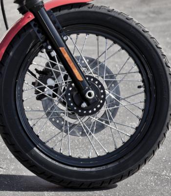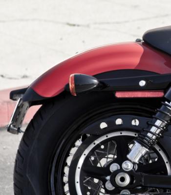 Das ungewöhnliche, beinahe puristische Bike verdankt die kraftstrotzende Kurvenagilität der schmalen Form und der ausgesprochen dynamischen Sitzhaltung. Sie beschränkt sich auf das Wesentliche und trägt rund um den 1 200 ccm V-Twin Schwarz, wo andere in Chrom schwelgen.