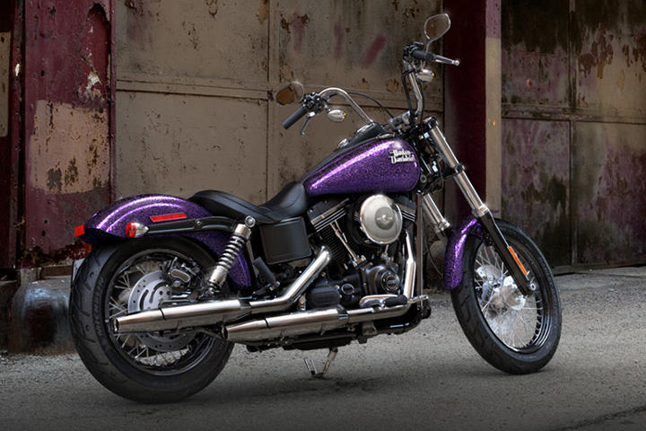 Optional erhalten Sie die Dyna Street Bob in Hard Candy Custom Lackierung, einem Finish mit extragroßen Metal Flakes, das an den faszinierenden Stil von Custom-Bikes der 1970er-Jahre erinnert: Satt leuchtende Farben und ein ultratiefes Finish.