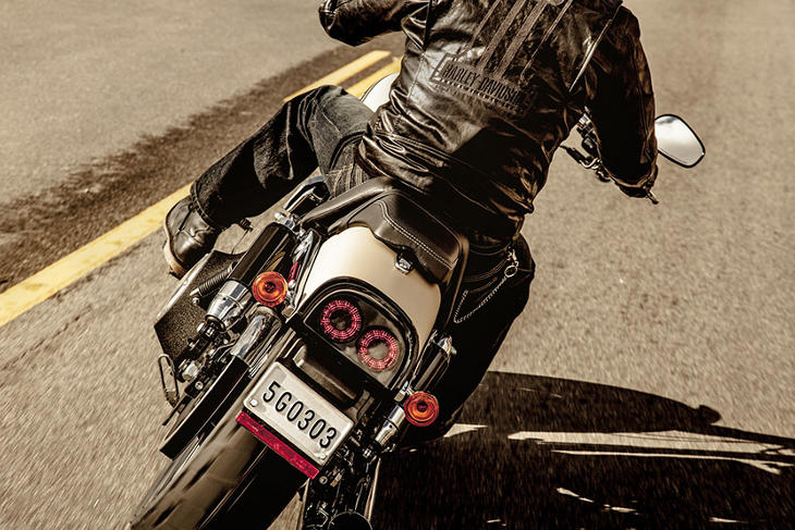 Fette Reifen, schwarzes Finish, grollende Auspufftöpfe, wuchtiger Lenker und vorverlegte Fußrasten: ein kompromissloses Bike für kompromissloses Fahren.