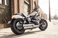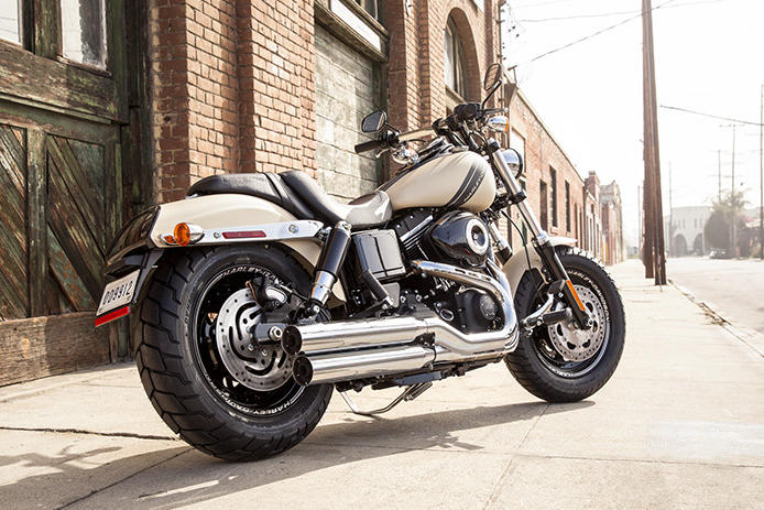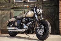 Umfangreiche Modellpflege wurde der beliebten Fat Bob 2014 zuteil. Unmittelbar ins Auge fallen die neuen Tank-Graphics und die neue, kompakte Linienführung des hinteren Fenders mit integriertem LED-Rücklicht. Der Sitz erhielt eine bequemere Form und einen neuen sportlichen Bezug. Ebenfalls neu gestaltet wurden die Tankkonsole und die Schalldämpfer. Die Maschine rollt auf neuen schwarzen, geschlitzten 16 Zoll-Leichtmetallscheibenrädern mit lasergravierten Graphics. Auch zahlreiche weitere Komponenten wurden in tiefes Schwarz getaucht. Das Bike wird in Vivid Black und Black Denim sowie in den neuen Farben Amber Whiskey und San Cammo Denim angeboten.