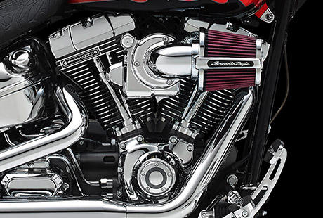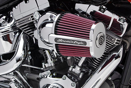 Er verdreht die Köpfe – bevor Ihr Bike in einer Staubwolke verschwindet. Der muskulöse, glänzend verchromte Krümmer, der exponierte Luftfilter und die hochglanzverchromte Endkappe mit eingraviertem Screamin Eagle Logo sehen nicht nur cool aus, sondern verhelfen dem großen Twin Cam 110 Motor der CVO Breakout auch zu brutaler Performance