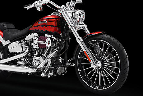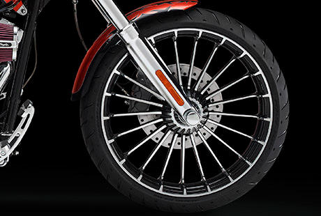 Mit optisch auf sie abgestimmten, polierten und verchromten Riemen- und Bremsscheiben im Turbine-Look bringen diese Räder metallisch strahlenden Glanz ans Bike. Sie zählen zu den faszinierendsten Rädern, die Harley-Davidson je gestaltet hat, und sind exklusiv an der CVO Breakout für 2014 erhältlich.