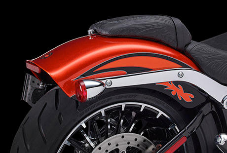 Schlank und auf das allernotwendigste Maß reduziert – so trägt der Heckfender der CVO Breakout zu ihrem langen, flachen Custom-Look bei. Um ein Optimum in puncto Stabilität, Gewicht und Design zu erzielen, bestehen die einteiligen Fenderhalter aus geschmiedetem, verchromtem und poliertem Leichtmetall.
