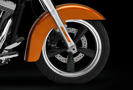 Die üppigen Fender sind ein klassisches Stilmerkmal – und schützen Sie und Ihre Switchback zugleich auf langen Strecken wirkungsvoll vor Spritzwasser und Schmutz. Auch die Hot-Rod-Räder im 5-Speichen-Design sind keineswegs nur Show: Ihre durchdachte Leichtmetallguss-Konstruktion trägt wesentlich zum zielgenauen Fahrverhalten dieses Bikes bei.