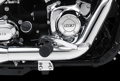 Genießen Sie den unverwechselbaren Look des Twin Cam 103™ Motors, der an seiner Herkunft keine Zweifel aufkommen lässt. Er ist voll und ganz im echten Harley-Davidson Stil gestaltet – mit einer Liebe zum Detail, die Sie bei anderen Marken vergeblich suchen werden. Die schwarzen, pulverbeschichteten Zylinderköpfe und Zylinder bilden einen prägnanten Kontrast zu den polierten Kühlrippenkanten und verchromten Ventildeckeln. Ein aus Metall gefertigtes Juwel: pur und vor Kraft strotzend. Von der klassischen Linie seiner Kühlrippen bis hin zu den klaren Konturen seiner Gehäuse und Deckel ist der Twin Cam 103™ ein rückhaltloses Bekenntnis zu allem, was der Zufriedenheit des Fahrers dient.