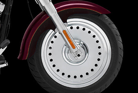 Die hochglanzverchromten Räder im Bullet Holes Style sprechen für sich selbst. Die perfekte Ergänzung zum fetten Look der Fat Boy.