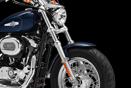 Mindestens so hoch wie Ihre Ansprüche an den Motor sollten Ihre Ansprüche an die Bremsen ihrer Maschine sein. Daher haben wir für das Modelljahr 2014 das Bremssystem der Sportster Modellfamilie umfassend überarbeitet. Wir erhöhten den Durchmesser der Bremsscheiben von 292 mm auf 300 mm und brachten einen kraftvollen Vorderradbremssattel mit 34-mm-Kolben sowie die dazu passende Bremszange am Hinterrad an. Für beide Räder kommen außerdem optimierte und äußerst effiziente Leichtmetall-Hauptbremszylinder zum Einsatz, und die Bremsleitungen sind nun mit Edelstahl ummantelt. Schließlich wollen wir, dass Sie Ihr Bike in allen Situationen so sicher wie mühelos verzögern können.
