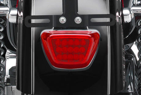Dezent im Look, aber groß und hell, wenn Sie es wirklich brauchen. Das LED-Rücklicht der Sportster 1200 Custom passt perfekt zur Kontur des Heckfenders, und die Anordnung reaktionsschneller roter Leuchtdioden ist weder bei Tag noch bei Nacht zu übersehen. Eng an das Rücklicht schmiegt sich die Halterung für das Kennzeichen.