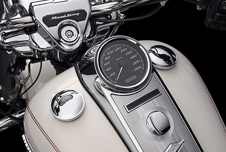 In diesem Jahr kommen die Anzeigeinstrumente der Road King Classic mit neuen Grafiken und 38 % größeren Ziffern. Auch die Anzeige der Motordrehzahl und des eingelegten Gangs wurde optimiert. Ein Blick genügt und Sie sind im Bilde.