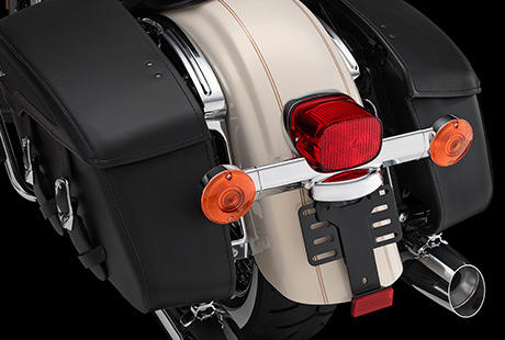 Das verchromte H-D Logo am unteren Ende des Heckfenders der Road King Classic steht für Qualität und Stil. Das Kennzeichen ist über dem Rücklicht montiert und wird zur besseren Sichtbarkeit mit LED-Leuchten angestrahlt.