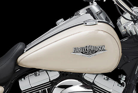 Der klassisch geformte Tank der Harley-Davidson Road King Classic prägt nicht nur das Erscheinungsbild des Bikes, sondern fasst auch 22,7 Liter Benzin, die ausgedehnte Touren ohne Tankstopp ermöglichen. Eine hochwertige zweifarbige Lackierung mit herrlichen, präzisen Pinstripes über die ganze Länge des Bikes und Tankmedaillons im klassischen Harley-Davidson Stil runden den stilvollen Custom-Touring-Look ab.