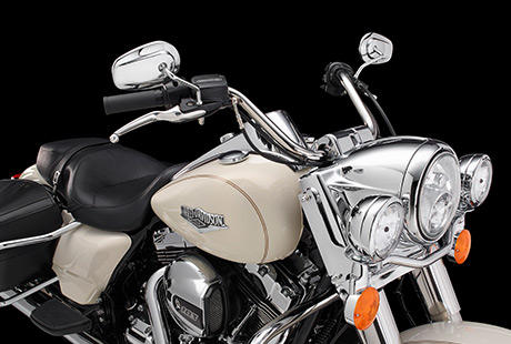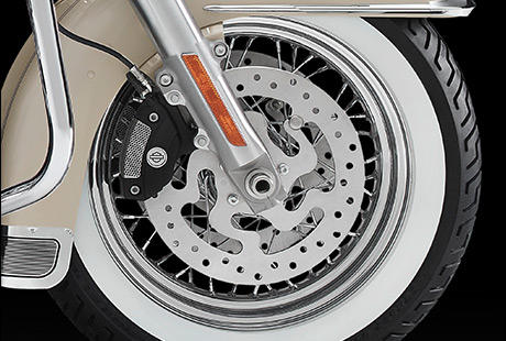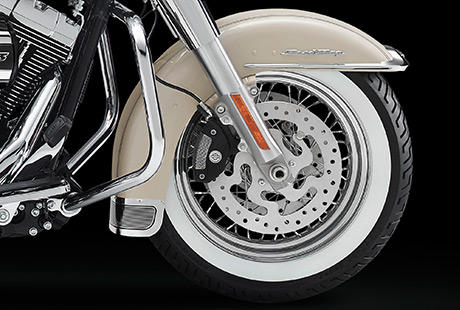Das zeitlose Design der Road King Classic unterstreichen 16-Zoll-Profile-Drahtspeichenräder und breite Weißwandreifen. Neu gestaltete Bremsscheiben geben jetzt den Blick aufs Rad frei – eine gelungene Synthese aus Nostalgie und moderner Technik. Und last but not least punktet die Classic mit einem tiefen Schwerpunkt, einem kleinen Wendekreis und einem leichten Handling bei niedrigen Geschwindigkeiten.