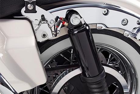 Mit der serienmäßigen Luftunterstützung können Sie das Fahrwerk Ihrer Maschine an die jeweilige Beladung, die Fahrbahnbeschaffenheit und Ihre ganz persönlichen Vorlieben angleichen. Reduzieren Sie den Luftdruck, um ein sanfteres Fahrerlebnis zu genießen, erhöhen Sie ihn, um das Fahrwerk härter zu machen. Das Ventil befindet sich zwischen Koffer und Heckfender. Bei dieser Harley-Davidson dreht sich alles um den Komfort – genießen Sie ihn!