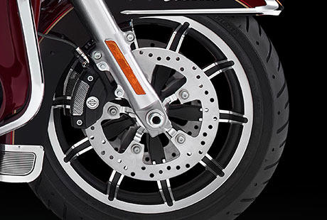 Am Front End der Electra Glide Ultra Classic fällt das 17-Zoll-Leichtmetallgussrad Impeller mit 10 Speichen auf. Passend dazu: das 16-Zoll Impeller Hinterrad. Die neuen Bremsscheiben fügen sich perfekt in das einzigartige Design der Räder ein. Wenn Sie schon dabei sind, dann gehen Sie aufs Ganze!
