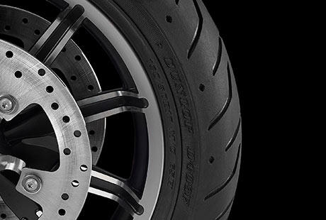 Dieser 180er Hinterreifen soll nicht nur Ihren Heckfender ausfüllen – er hat’s in sich. Die härtere Gummimischung in der Mitte der Lauffläche bürgt für eine hohe Laufleistung, während die weichere Mischung an den Flanken in Kurven zuverlässig für Grip sorgt. Der perfekte Reifen, um Meile für Meile die Agilität dieses Bikes unter Beweis zu stellen. Und das Lächeln, das Ihnen die Maschine in jeder Kurve ins Gesicht zaubert, hält bis an Ihr Ziel an – garantiert!