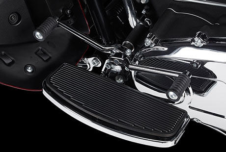 Die Möglichkeit, die Fußhaltung zu variieren, sorgt unterwegs für ein entscheidendes Plus an Langstrecken-Komfort. Harley-Davidson Fahrertrittbretter haben sich über Jahrzehnte bewährt. Und dank der höhenverstellbaren Beifahrer-Trittbretter kommt auch Ihr Passagier nicht zu kurz. Gummi-Elemente entkoppeln die Trittbretter effizient von den Motorvibrationen. Und die Schaltwippe sorgt für ein einzigartig cooles Schaltgefühl. Daran gewöhnt man sich im Nu – und will es nie mehr missen!
