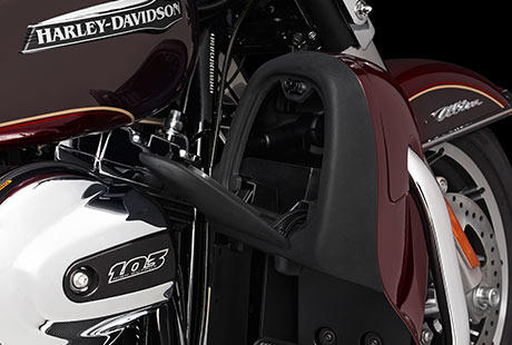 Um dem Fahrtwind Paroli zu bieten, zog Harley-Davidson alle Register: Strömungsmechanik und komplizierte Algorithmen auf Supercomputern sowie die Rückmeldungen von unzähligen Windkanaltests mit Fahrern im Sattel. Danach ging es für Tausende von Meilen hinaus auf die Straße – mit echtem Fahrtwind, echtem Sturm, echtem Nieselregen und echten Wolkenbrüchen. Das Ergebnis: Eine klassische und dennoch vollkommen überarbeitete Batwing Verkleidung, die für eine sanftere Luftumströmung sorgt und die Verwirbelungen im Kopfbereich reduziert. Der neue, auf Tastendruck zu öffnende und zu schließende Luftkanal leistet den größten Beitrag dazu. Das Gefühl im Sattel wird noch besser.