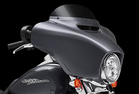 Um dem Fahrtwind Paroli zu bieten, zog Harley-Davidson alle Register: Strömungsmechanik und komplizierte Algorithmen auf Supercomputern sowie die Rückmeldungen von unzähligen Windkanaltests mit Fahrern im Sattel. Danach ging es für Tausende von Meilen hinaus auf die Straße – mit echtem Fahrtwind, echtem Sturm, echtem Nieselregen und echten Wolkenbrüchen. Das Ergebnis: Eine klassische und dennoch vollkommen überarbeitete Batwing Verkleidung, die für eine sanftere Luftumströmung sorgt und die Verwirbelungen im Kopfbereich reduziert. Der neue, auf Tastendruck zu öffnende und zu schließende Luftkanal leistet den größten Beitrag dazu. Das Gefühl im Sattel wird noch besser.