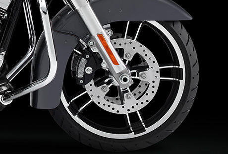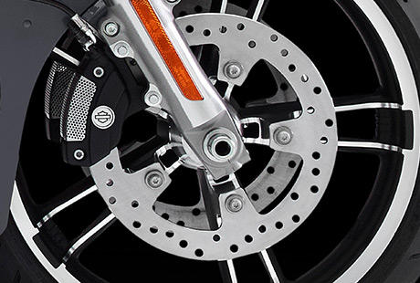 Am Front End der Street Glide fällt das 19-Zoll Enforcer Rad ins Auge Passend dazu: das 16-Zoll Enforcer Hinterrad. Die neuen Bremsscheiben fügen sich perfekt in das einzigartige Design der Räder ein. Wenn Sie schon dabei sind, dann gehen Sie aufs Ganze!