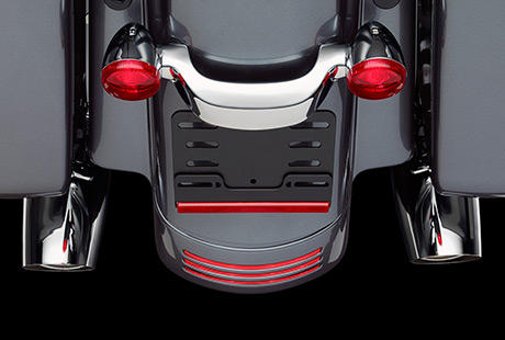 Die Tri-line Rückleuchtenkombination verleiht dem Heck der Maschine eine schnörkellose Linienführung. Ein tief angebrachter Kennzeichenhalter mit LED-Beleuchtung vervollständigt das einzigartige Custom-Design.