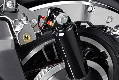 Mit der serienmäßigen Luftunterstützung können Sie das Fahrwerk Ihrer Maschine an die jeweilige Beladung, die Fahrbahnbeschaffenheit und Ihre ganz persönlichen Vorlieben angleichen. Reduzieren Sie den Luftdruck, um ein sanfteres Fahrerlebnis zu genießen, erhöhen Sie ihn, um das Fahrwerk härter zu machen. Das Ventil befindet sich zwischen Koffer und Heckfender. Bei dieser Harley-Davidson dreht sich alles um den Komfort – genießen Sie ihn!