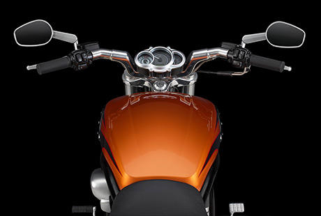 Ab auf die Straße – in einer sportlichen Sitzhaltung, die zum Power Cruising einlädt. Der wuchtige Lenker mit innenliegender Kabelführung trägt eine gegossene Leichtmetall-Hülle über einem einzölligen, leicht abgewinkelten Stahlrohr. Langen Sie ruhig ordentlich hin! Die Instrumenteneinheit mit leicht abzulesenden Tacho-, Drehzahl- und Tankanzeigen setzt einen markanten Custom-Akzent.