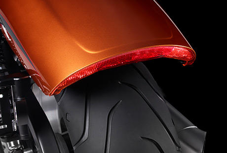 In der Rückleuchteneinheit der V-Rod Muscle, in die auch die Blinker integriert sind, kommen leuchtstarke LEDs zum Einsatz. Das knapp geschnittene Heck überspannt den wuchtigen Hinterreifen und fügt sich harmonisch in das Designkonzept des Bikes ein.