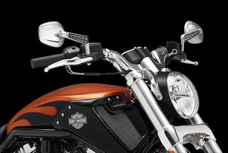 Die vorderen LED-Blinker ergänzen das saubere, stromlinienförmige Design der V-Rod Muscle. Die hellen, funktionalen Blinker sind geschickt in die Spiegelschäfte integriert und verleihen der Frontpartie einen cleanen Custom-Look.