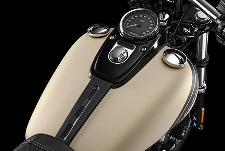Sie ist schlank, schwarz und ultraflach: Die neue Tankkonsole mit 5 Zoll großem Tachometer und integriertem Zündschloss verleiht der Fat Bob® einen charakteristischen Custom-Look