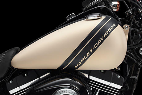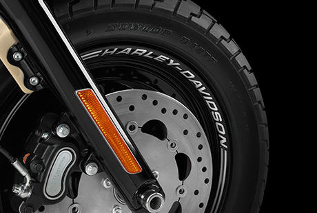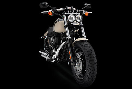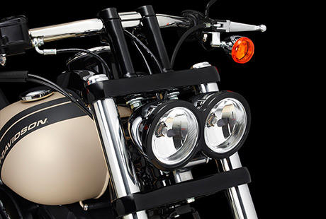 Der lange Radstand und der kraftvolle Look tragen zur Charakterstärke der Fat Bob® bei. Die wuchtige Gabel, der Doppelscheinwerfer und das fette 16-Zoll-Vorderrad mit dem 130er Reifen unterstreichen unmissverständlich die Autorität und Leistungsstärke dieser Maschine.