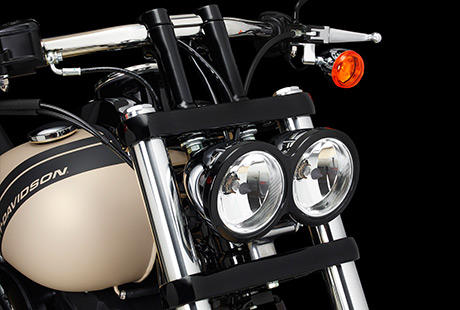 Ein Plus an an Custom-Style und coolem Look. Die Fat Bob ist mit unverkennbaren verchromten Doppelscheinwerfern mit schwarzem Zierring ausgerüstet, die die Nacht zum Tage machen. Damit entgeht Ihnen nichts in Ihrem Blickfeld, und mit einer doppelt dicken Chromschicht ziehen Sie zugleich die Blicke magisch an.