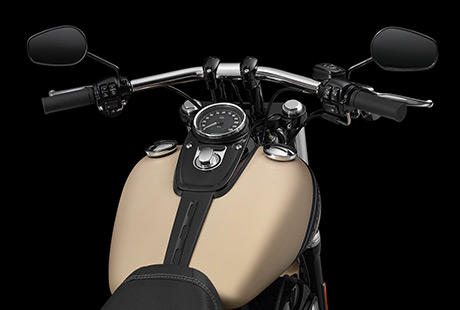 Die Fat Bob ist mit einem 1 1/4-Zoll- Drag Bar Lenker mit hohem Riser ausgestattet. Seine Form erinnert an die aggressives Viertelmeilen-Dragster, und die innenliegende Kabelführung sorgt für einen cleanen Look in Ihrem Blickfeld.