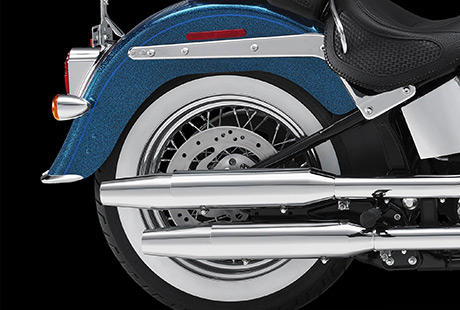 Eines der Stilmerkmale der Softail Deluxe sind die nostalgischen Weißwandreifen mit den Premium-Speichenrädern. Eine Verbeugung vor dem Boulevard-Look der 50er Jahre. Diese fetten Reifen sind ein Blickfang von Harley-Davidson, der in jedem Umfeld den Einsatz erhöht. Absolut Old School ohne Abstriche bei Handling oder Performance.