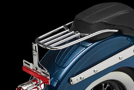 Zu den individuellen Details der Softail Deluxe gehört ein klassischer Gepäckträger, der sich direkt an den Soziussitz anschmiegt und eine perfekte Kombination von Form und Funktion darstellt. Minimalistisch im Design, aber enorm nützlich auf der Straße. Er bietet Platz für Ihr wichtigstes Gepäck und etwas zusätzlichen Glanz durch strahlendes Chrom.