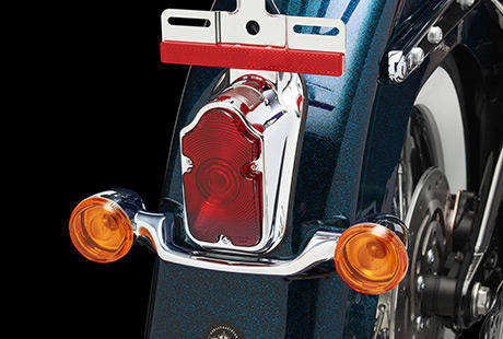 Ein echter Klassiker. Das flache und verchromte Rücklichtgehäuse ist typisch für Harley-Davidson. Zusammen mit unseren schlanken, verchromten Blinkern, die es flankieren, sorgt es für einen unverkennbaren Look am Heck dieser Maschine.