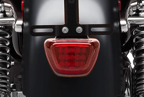 Dezent im Look, aber groß und hell, wenn Sie es wirklich brauchen. Das LED-Rücklicht der Sportster 1200 Custom Limited Edition B passt perfekt zur Kontur des Heckfenders, und die Anordnung reaktionsschneller roter Leuchtdioden ist weder bei Tag noch bei Nacht zu übersehen. Eng an das Rücklicht schmiegt sich die Halterung für das Kennzeichen.